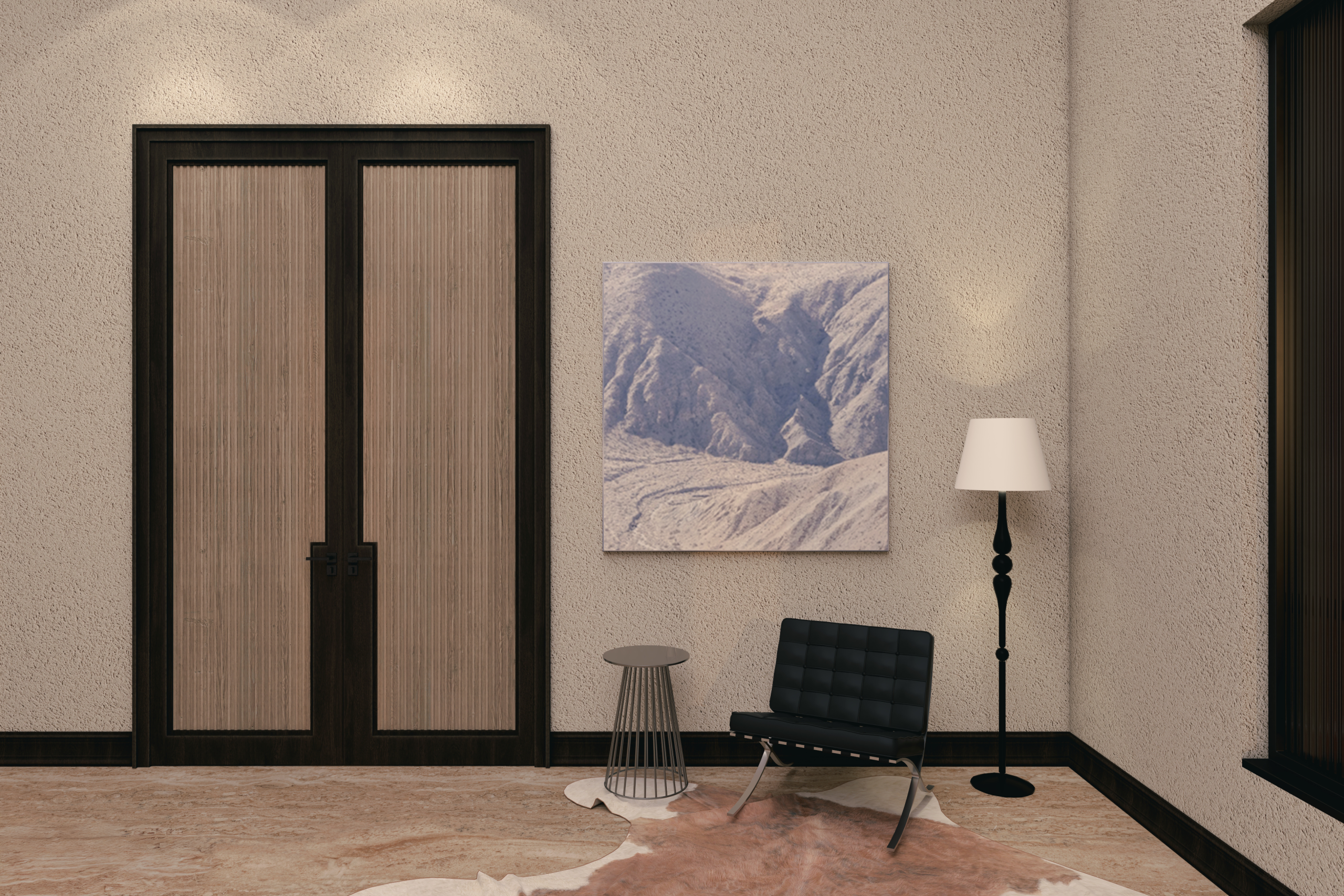 Dikey lam kaplama detaylarıyla öne çıkan bu çift kanatlı model, yüksek tavanlı ve geniş hacimli yaşam alanlarında güçlü bir duruş sergiler. Koyu renk çerçevesi ile açık yüzey dokusu kontrast oluşturur; bu da ürünü hem modern hem de klasik dekorasyonlarda kullanıma uygun hale getirir. Sessiz kapanma özelliğine sahip manyetik sistemlerle uyumlu olan tasarım, mimari bütünlük arayan projeler için ideal bir seçenektir.